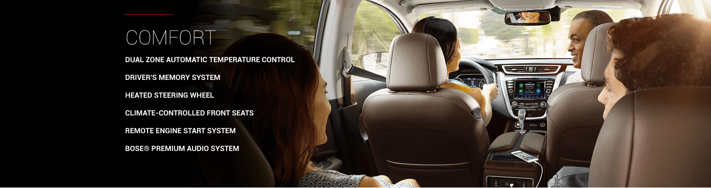 Murano's premium interior surrounds everyone with welcomed and thoughtful comfort. Enjoy available features that let you and your passengers that gives warm you up or cool off at the touch of a button. While available premium audio gives every passengers the best seat in the house.