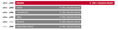 *Claim based on years/mileage (whichever occurs first) covered under the New Vehicle Limited Warranty basic coverage. Ward's in-market Large Pickup Segmentation and Small Pickup Segmentation v. 2019 TITAN and TITAN XD and Wards Light Vehicle Segmentation: 2019 Nissan NV Cargo, NV Passenger v. in-market Large Van Class; 2019 Nissan NV200® v. in-market Small Van Class. Commercial Vans compared only. Nissan's New Vehicle Limited Warranty basic coverage excludes tires, corrosion coverage and federal and California emission performance and defect coverage. Other terms and conditions apply. See dealer for complete warranty details. NV200® Taxi is covered under a separate limited warranty with a different level of coverage.